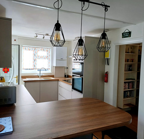There are 14 steps with handrail up to the front door leading into the brand new Kitchen/diner with induction electric hob and eye level cooker and grill, dishwasher, fridge with freezer compartment, microwave and seating for 4 at the breakfast bar.